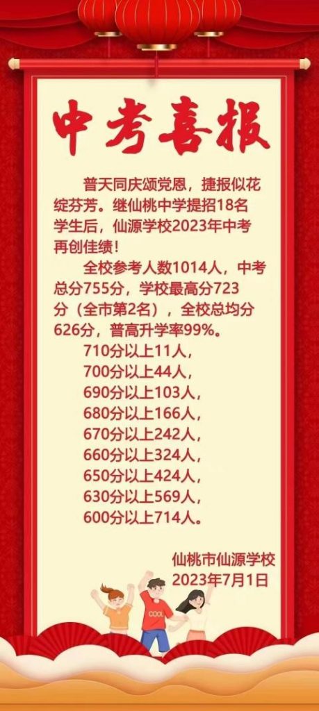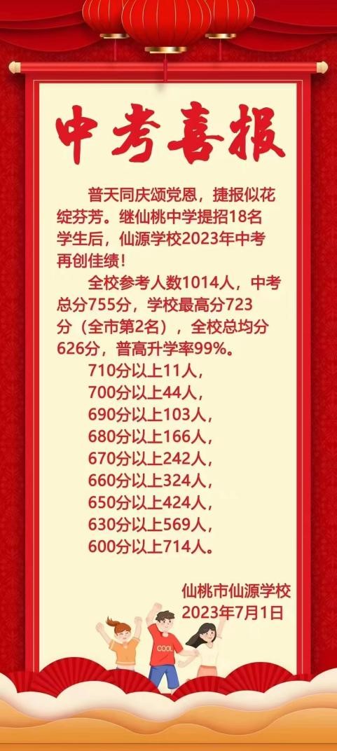 恭喜仙源學(xué)校在2023年中考中取得優(yōu)異的成績!全校參考人數(shù)1014人,中考總分755分,學(xué)校最高分723分(全市第2名),全??偩?26分,普高升學(xué)率99%!